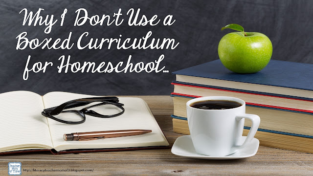 I have only been homeschooling for two years, but prior to staying home with my two youngest sons, I was a classroom teacher and reading specialist for over 20 years. Never during my career did I teach exclusively from a book or scripted program. Now, I'm not saying that teaching from a book or "boxed" curriculum is bad; it just isn't a good fit for how my son learns or how I teach.